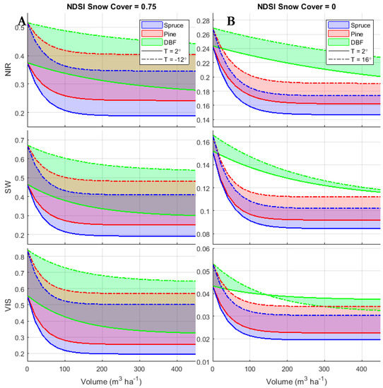 The albedo in all broad bands increased with decreasing temperatures during the snow season. The factors that were likely contributing to the differences between the −12° and 2° curves shown in Figure 4A were the amounts of snow intercepted and held by forest canopies and the physical properties of snow itself. For instance, when the monthly SC is 0.75 and monthly T is −12 °C, the monthly albedos of a young or newly harvested stand (i.e., when volume = 0) can be as high as 0.86, 0.67 and 0.54 for the VIS, SW and NIR bands, respectively. These values reduce as the forests age and the stand volume (or aboveground biomass) increases. For the pine and spruce endmembers, Figure 4A suggests that the albedo varies only slightly above ~150 m3 ha−1. However, the asymptotic albedo is not reached within the plotted range for DBF (i.e., 450 m3 ha−1).