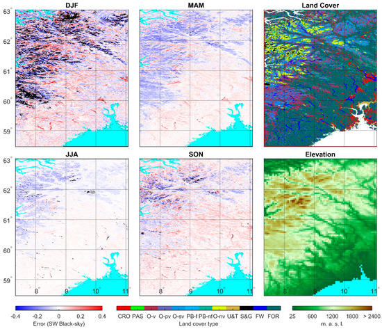 Given their slightly higher accuracy, only the prediction error for the models fit at the effective spatial resolution is presented henceforth. Starting at the pixel level, Figure 5 illustrates the geospatial distribution of the seasonal error (SW broadband, black-sky) within the validation region. The largest errors in all seasons were mostly confined to the higher elevation regions of the north and west. The largest errors were found in winter (DJF) in these regions—regions with monthly T and SC values at the edge of or exceeding the range found in the model training region. In general, the largest positive errors (red values, Figure 5) in winter were found over the largest inland waterbodies (“FW”). Although this error was reduced, the positive error seen over larger freshwater bodies was also evident in spring (MAM) and autumn (SON). On average, the mean SC over these larger freshwater bodies during the colder seasons in 2006–2010 was found to be lower than for the smaller freshwater bodies, which resulted in overestimates of the surface albedo when combined with a low temperature sensitivity parameter (, Table 2). For all seasons, the larger negative errors (blue values) were typically found for pixels with larger proportions of the two open area types “O-nv” and “O-sv”, which were mostly concentrated at the higher elevation regions of the north and west (Figure 5, third column of sub-panels).