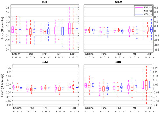 As for JJA, the error interquartile ranges for the NIR band were larger than for the VIS band during autumn (“SON”; Figure 5). The spread in error in SON was second largest after DJF although median errors were similar. As for DJF and MAM, the spread in errors (interquartile ranges) was largest for DBF.