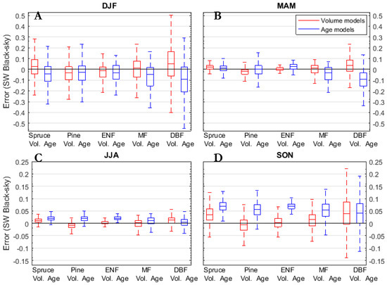 Seasonal mean error in predicted albedo in forests (SW black-sky) between the Volume-based models and the Age-based models of Bright et al. [27]: (A) December-January-February; (B) March-April-May; (C) June-July-August; and (D) September-October-November. Horizontal lines represent the medians, boxes represent the interquartile ranges and dashed whiskers represent the extent of the upper and lower quartiles.