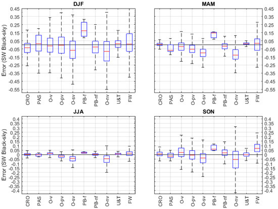 Shifting our attention to the non-forest endmembers and the limiting results presented henceforth of the full SW broad band, spreads in model errors were largest in DJF as expected (Figure 8, upper left panel). Median prediction errors were under 0.05 for all land cover types, except for “O-sv”, “PB-f” and “O-nv”. Median errors for “O-sv” and “O-nv” were negative for each season. Median error for “PB-f” was positive for all seasons although we note that the number of MCD43A3 retrievals containing “PB-f” homogeneity to ≥95% was limited to just three.