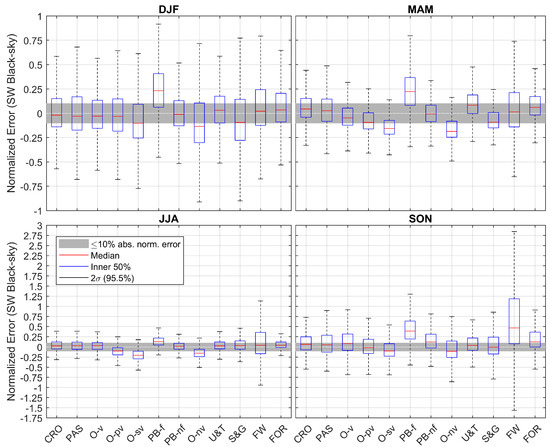In order to more rigorously assess whether these error patterns were systematic, we relaxed the homogeneity requirement described in Section 2.9 and recomputed the error statistics for all pixels using the sub-MODIS pixel modes from AR5/SR16 to define the majority land cover type. Figure 9 contains the results after normalizing the seasonal mean prediction error to the MCD43A3 retrievals, which reinforces the above-mentioned results that error patterns for “PB-f”, “O-sv” and “O-nv” were indeed systematic.