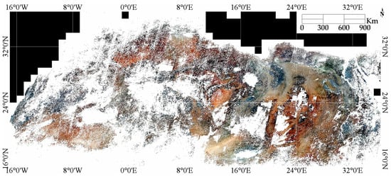 Landsat 8 OLI data were chosen for this work, as the analyses of Knight et al. [] and Markham et al. [] reported an OLI reflectance calibration accuracy of approximately 3%. The key spectral and spatial characteristics of the OLI are presented in Table 1. Through the use of the GEE system, all pixels of North Africa acquired by the OLI over the three-year period were screened for clouds/cloud shadows and saturated pixels. These data were spatially resampled from the native resolution of 30 × 30 meters to 300 × 300 meters. A temporal mean, standard deviation, and uncertainty (ratio of temporal standard deviation to temporal mean) were calculated for each pixel location, along with a count of the number of measurements that went into the statistics calculations. These summary statistics data were then “stacked” into data cubes and “tiled” into 1° latitude by 1° longitude images. The image and pixel sizes were chosen as a practical trade-off between the amount of data retrievable from GEE and the current processing and storage capabilities of the South Dakota State University (SDSU) Image Processing Laboratory systems. In addition, resampling the tiles to 300 m spatial resolution did not significantly degrade the information obtainable from them as much of North Africa is relatively spatially uniform.