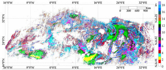 K-means algorithm was initially “seeded” with cluster means represented by the temporal means of two randomly chosen pixels from the mosaicked images. The Euclidean distance between cluster means (two randomly chosen pixels) and each pixel of the mosaicked image pixels is calculated in Step 2. Third step classifies all the pixels of North Africa based on their minimum distance to the cluster’s mean. The average of the new classified pixels is calculated and considered as the new cluster mean in Step 4. The difference between the current cluster mean and the new cluster mean is computed and if the difference is more than the threshold 0.0001 then current cluster mean is replaced by newly computed cluster mean and again start from Step 2. A mean difference threshold of 0.0001 was used to determine whether new clusters should be created; this threshold value was chosen to ensure that final convergence of the classification remained independent of the chosen starting pixels. For cluster mean differences of less than the difference threshold, the spatial uncertainties of the current set of clusters was calculated. If any cluster’s spatial uncertainty exceeded 5% in any band, the current cluster count was incremented by 1, and the classification process was repeated; otherwise, the classification process terminated at the current cluster count. A 5% spatial uncertainty threshold was selected in order to balance aggregation within cluster regions (i.e., minimizing the creation of smaller cluster regions that are more widely spread) while ensuring lower spatial uncertainty. For this work, the classification process identified 19 distinct clusters.