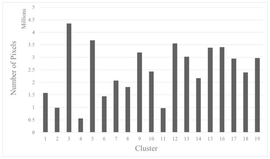 Figure 4 shows a bar graph of the resulting pixel counts for each cluster. Among the clusters, Cluster 3 has the largest number of pixels (approximately 4.3 million). Cluster 13 (the light green graph in Figure 3 has approximately 3 million pixels. Although Cluster 3 has the largest pixel count, its pixels are more widely distributed in non-contiguous regions. The Cluster 13 pixels, on the other hand, are grouped into large contiguous regions widely distributed across North Africa, making this cluster a potential candidate for EPICS-based calibration.