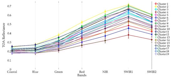 Figure 5 shows the multispectral signature of each cluster represented by the mean TOA reflectance and ±1σ standard deviation.