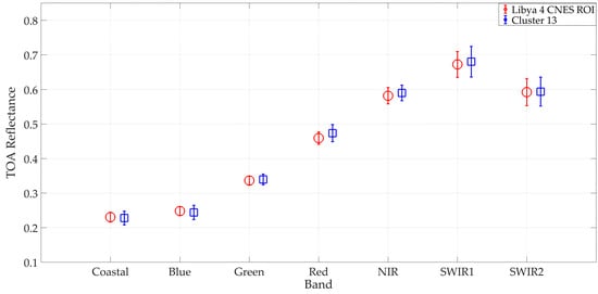 As Cluster 13 spread across the continent, it also includes one of the most widely used traditional PICS i.e., Libya 4, so the temporal behavior of Cluster 13, using selected 16 paths and rows, is compared with Libya 4 temporal behavior as shown in Figure 6. For comparison, Libya 4 CNES (French: Centre national d’études spatiales) region of interest (ROI) is chosen as it is regarded as one of the best regions by CNES based on the long term trending of North African and Arabian desert [,]. In Figure 6, the left and right figure present the temporal trend of Libya 4 and Cluster 13, since launch to mid-August 2018, using Landsat 8 OLI. The behavior of Cluster 13 is the same as the behavior of traditional PICS, Libya 4, but it provides a significantly large number of acquisitions than Libya 4 within the same interval of time, i.e., Libya 4 provides 110 could-free observations since launch to mid-August 2018 whereas Cluster 13 provides nearly daily observation and offers 1434 cloud-free observations within the same interval of time. The temporal mean (±2 sigma) of Cluster 13 and Libya 4 are also compared in Figure 7. As Libya 4 temporal mean lies within the uncertainty bar of Cluster 13 temporal mean, the temporal mean of both Libya 4 and Cluster 13 are same. This implies that despite its continental scale spatial extent, Cluster 13 has the same response like the Libya 4 CNES ROI.