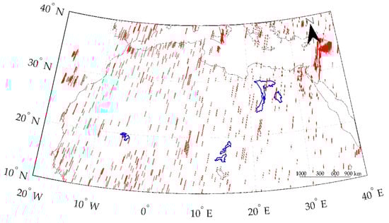 A cluster-based cross calibration approach would need to have accurate knowledge of the cluster’s expected hyperspectral response, in order to derive appropriate scaling factors to compensate for spectral response differences between a well calibrated “reference” sensor and the sensor to be calibrated. In the absence of ground truth measurements, this knowledge can be derived from available hyperspectral image data. Figure 10 shows a simplified diagram of the five largest contiguous regions of Cluster 13 across North Africa (represented by the blue color) and a map of the available Hyperion coverage over the same regions (represented by the red color). Hyperion is a hyperspectral pushbroom sensor imaging the Earth’s surface in the 400–2500 nm portion of the solar spectrum, in 242 overlapping bands with a spectral resolution of approximately 10 nm; 196 of these bands are well calibrated. It images a 7 km by 100 km swath at a spatial resolution of 30 m [,,,]. Preliminary investigation has identified a set of 731 Hyperion scenes imaging these regions. After filtering the set for 10% or less cloud cover and sensor view angles within ± 5° of nadir, 101 scenes were identified that could be used to determine the hyperspectral profile. As Cluster 13 regions are spectrally similar (as determined by the classification process), it could be expected that the hyperspectral profile of a region may be used as a “representative” profile for the entire cluster.