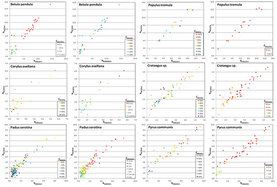 The effectiveness analysis included an impact analysis of the parameters of trees and shrubs (height, crown diameter, crown density) on the tree and shrub detection using the DIM technique. The comparison of the height of trees and shrubs obtained based on ALS data and as a result of DIM techniques depending on the species, height, size, and crown density of the examined trees and shrubs are presented in Table 5, Table 6, Table 7 and Table 8, and in the sub-figures in Figure 9. The influence of crown diameter and density (by species) on the accuracy of the height of trees and shrubs using DIM techniques are illustrated in Figure 10.