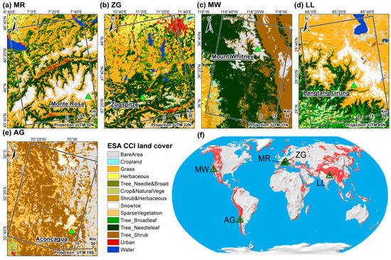Land cover types (derived from European Space Agency (ESA) Climate Change Initiative (CCI) land cover product) for the five selected test sites: (a) Monte Rosa (MR), (b) Zugspitze (ZG), (c) Mount Whitney (MW), (d) Landtang Lirung (LL), and (e) Aconcagua (AG). Location of each region around the globe is illustrated in (f).