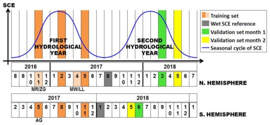 To validate our algorithm across different years and months/seasons, a total of three datasets (including one for the first hydrological year and two for the second hydrological year) were selected for each study area (details are shown in Figure 2 and Table 2). In order to represent snow cover conditions as well as to maximize the similarity of period sample used in each region, the months of November, February and May of the first year were selected in each region. However, for Mount Whitney (MW) and Landtang Lirung (LL) sites, the months of February, April, and May were chosen instead. This is due to the fact that in the MW and LL regions, the imagery was stable only after February 2017, as a result of a much rarer revisiting frequency of Sentinel-1, according to their orbit design, in comparison to European regions. Regarding Aconcagua (AG), the only site located in the southern hemisphere, has opposite season, the corresponding months samples were used. Two different months of imagery were used for external validation in examining the month-dependency of the established model set.