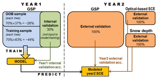 Although previous studies often neglect the importance of a detailed validation approach, it is indispensable to comprehensively examine the robustness and correctness of a proposed model with internal and external validation efforts. Consequently, several validation steps have been incorporated into the presented study. It complements the internal validation illustrated in Section 4.1, with addition to external validation based on the GSP, optical-based SCE, and in-situ snow depth data, as illustrated in the data splitting of Figure 3 and workflow of Figure 5. The results of these accuracy assessments are presented in the following sections.