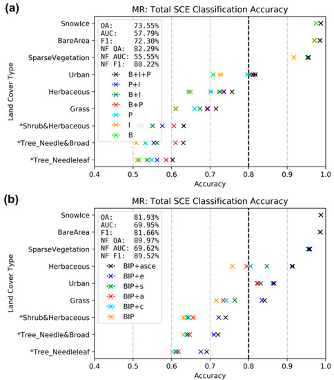 To test the influence of the SAR parameters on the model performance, different combinations of SAR-based observations were employed to train MR’s model set. To assess their uncertainties, 20 iterations were processed for each trial. Resultant accuracy assessments are illustrated in Figure 4a. It was obvious that for all land cover classes, the combination of all available SAR parameters (B + I + P) produced the highest accuracy. When relying only on one SAR-based observation, using P leaded to higher classification accuracy than relying on I or B. The accuracy improvement between using only single SAR parameters and the combination of all available parameters (B + I + P) was significant. Moreover, it was observed that for land cover classes that pose considerable challenges in detecting snow cover using SAR (e.g., forested areas), combining all available SAR parameters leaded to a significant improvement of classification accuracy.