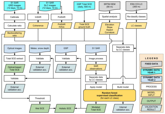 The overall workflow of mapping total SCE, by applying a supervised RF classification model set as well as detecting wet SCE with “Nagler’s method”, is illustrated in Figure 5.