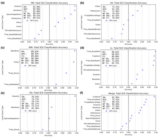For the first (individual) case, the results of the accuracy assessment are presented in Figure 6a–e. The overall accuracy of Monte Rosa (MR), Zugspitze (ZG), Mount Whitney (MW), Landtang Lirung (LL), and Aconcagua (AG) were around 80%, 75%, 90%, 90%, and 80%, respectively. The F1 score for each test site was higher than 70%. AUC scores for all regions were around 70% or higher which indicated a good model performance; with the exception of ZG, with around 60%, which was still satisfying. The amount and distribution of land cover vary between the test sites and affect the overall accuracy of the model performance. The complexity of land cover types within the CCI land cover product used as auxiliary data in this study was considerably higher in the Europeans Alps and Asian Himalaya when compared to the Andes and Rocky Mountains (see Figure 1). As already reported in earlier SAR-based snow cover studies [17,18], lower accuracy values are achieved in grassland as well as forested areas (classes marked as * in Figure 6), with the exception of the LL test site. To examine the negative effect of grassland and forest areas of the classification performance, the overall accuracy, F measure, and AUC score values have also been calculated for non-forest classes (indicated in Figure 6 and abbreviated with NF OA, NF F1, and NF AUC).