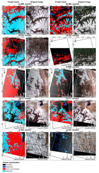 Fmask-based total snow cover extent classification derived from Landsat and Sentinel-2 as well as true-color composites for each test site: (a) Monte Rosa (MR), month 1 (23 March 2018); (b) Monte Rosa, month 2 (18 May 2018); (c) Zugspitze (ZG), month 1 (25 March 2018); (d) Zugspitze, month 2 (07 May 2018); (e) Mount Whitney (MW), month 1 (16 March 2018); (f) Mount Whitney, month 2 (03 May 2018); (g) Landtang Lirung (LL), month 1 (13 March 2018); (h) Landtang Lirung, month 2 (16 May 2018); (i) Aconcagua (AG), month 1 (13 June 2018); (j) Aconcagua, month 2 (04 May 2018).