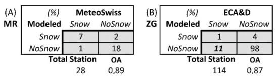 In addition to the validation based on satellite observations, snow depth (SD) measurements originating from meteorological stations are available for some study areas. For the European region, few countries’ national meteorological agencies, for example in Switzerland, provide free access to these data. Additional measurements of daily SD are available from the European Climate Assessment and Dataset Project (ECA&D) [80]. The study sites MR and ZG were chosen to be validated with 28 stations of MeteoSwiss and 114 stations of ECA&D, respectively. The locations of the meteorological stations are illustrated in Figure 10. However, as more than 50% of the stations are located in relatively low elevation zones, which are generally completely snow-free in May, only March observations were validated for the presented study. For the study site MW, only one meteorological station was available, while for LL and AG, no suitable and freely accessible station data could be acquired. Therefore, these three regions were not validated with meteorological records. The confusion matrix, displaying the accuracy derived from the comparison of the SAR-based SCE classification with station data, is illustrated in Figure 11. Whilst not considering the skewed observations (station records contain less “snow-covered” data (i.e., SD higher than 0 cm)), both regions achieved overall accuracy values of more than 87%. However, a slight under-estimation can be found in the ZG region. This could be because there might exist a certain threshold of SD for the spaceborne SAR-based approach to detect that a pixel is snow-covered, such as 1 cm for MODIS snow cover product [81] and 2 cm for passive sensors [82].