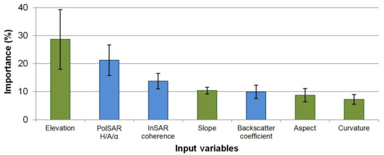 The average importance of input variables for all five study regions. Blue and green bars represent SAR-based observations and topographical factors, respectively.