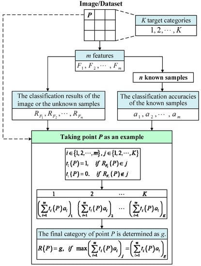 The PWMF method can be used to fuse the classification results of the multiple features. In the PWMF method, after obtaining the classification accuracy of the known samples for each feature, according to the classification accuracy of the different features, the weight values are specified for the corresponding features, and the classification results of the features with higher weight values are considered to have a higher credibility. The schematic diagram of the PWMF method is shown in Figure 1. In the following paragraphs, the principles and processes involved in the PWMF method are described in detail.