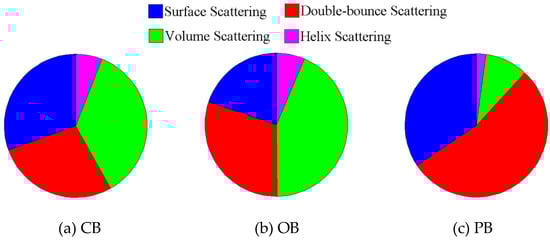 In an earthquake-hit region, there will be both CB and intact buildings, which consist of both PB and OB. Compared to the Freeman three-component decomposition method (FTCD) [38], the Yamaguchi four-component decomposition method (YFCD) contains the component of helix scattering (HS), and it is more appropriate for urban regions. Thus, YFCD is preferred for analyzing building SM in earthquake-hit regions. In the results of the classical YFCD method [39,40], the predominant scattering component of CB, PB, and OB is VS, DBS, and VS, respectively. The wall of a parallel building and the ground forms a dihedral structure, so the PB are dominated by the DBS mechanism, and their SP is particularly strong. The dihedral structure of CB is destroyed, and the polarization basis of OB is rotated. Therefore, both CB and OB are dominated by the VS mechanism, and their SP is relatively weak. Yamaguchi et al. [41] modified the classical YFCD method to improve the recognition performance for OB. Therefore, the improved YFCD method is employed as the polarimetric decomposition approach of this work, and the details about improved YFCD method can be found in the reference written by Yamaguchi et al. [41].