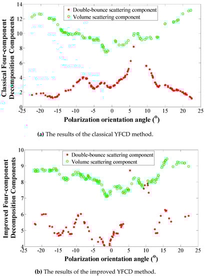 We used the improved YFCD method to decompose the scattering components (SC) of each sample for the three kinds of buildings marked in Figure 10 into surface scattering, DBS, VS, and HS. The relative contributions of the different SC for the three samples were then calculated, as shown in Figure 2. In addition, a comparison diagram for the DBS component and the VS component obtained from the classical YFCD method and the improved YFCD method is shown in Figure 3. Based on the same pixel, the polarization orientation angle (POA) value is shown in horizontal axis and the SC generated from YFCD method are corresponding to vertical axis.