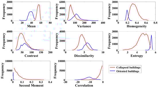 In addition to polarimetric features, abundant texture features can also be extracted from PolSAR images. Because the texture features of buildings are obvious in PolSAR images, they can be used for building recognition [42]. Furthermore, there is a clear difference between the CB and the OB in texture. Here, the OB are the UDB, so they have the basic characteristics of general buildings and present relatively regular textures. However, the CB show a disordered distribution, and their textures are irregular. To overcome the dilemma of the easily mixed class problem, the texture features can be used to differentiate the undamaged OB from the CB. Gray Level Co-occurrence Matrix (GLCM) [43] is a very popular statistical approach used to get features from the image texture. Generally, the eight second-order statistical texture parameters of variance, mean, contrast, homogeneity, entropy, dissimilarity, correlation, and second moment can be achieved based on GLCM. Comparing the histograms of the two kinds of buildings for the eight texture features based on GLCM in Figure 4, it can be found that the four texture features of homogeneity, mean, entropy, and correlation have a better ability to separate the two kinds of buildings.