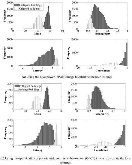 In order to visually show the separation performance, taking the samples marked in Figure 10 as an example, the histograms of the four texture features for the two kinds of buildings extracted from the OPCE image and from the SPAN image are shown in Figure 5. Texture extraction from the SPAN image and from the OPCE image represent before and after using the OPCE algorithm to enhance the contrast, respectively. Comparing Figure 5a and Figure 5b, it can be seen that, for all four texture features, the differences between the two kinds of buildings are clearly enhanced by the use of the OPCE image.