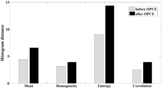 Figure 5 and the above corresponding statement are the qualitative representation. The histogram distance is used to make a quantitative description for the discriminative performance after implementing the OPCE contrast enhancement operation. The histogram distance can be used to measure the differences between two histograms. A bigger histogram distance usually corresponds to a bigger difference, and vice versa. Here, the histogram distance method is employed to prove that the OPCE method for contrast enhancement can improve the separation properties between the OB and the CB of the four texture features. In this work, the Euclidean distance is used to compute the histogram distance. The Euclidean distance d between histogram e and histogram f can be modeled as [48]: