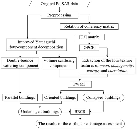 Only using a SPEPI for BDA has the advantage of accurately and rapidly acquiring earthquake damage information. The leading SM of both the undamaged OB and the CB is VS, and the characteristics of the OB are very similar with the CB in PolSAR data. Although the improved YFCD is executed on the PolSAR imagery to enhance the DBS power of the OB, the dominant SM of OB is still VS. Fortunately, through experimental analysis, we found that there are differences for the texture features between the undamaged OB and the CB. Therefore, in this work, the PWMF method is proposed to fuse the four texture features of mean, homogeneity, entropy, and correlation, for BDA accuracy improvement. Before this, the OPCE algorithm is employed to improve the contrast ratio of undamaged OB and CB, and the differences of the texture features are also increased. The OPCE power image is used to extract the four texture features of mean, homogeneity, entropy, and correlation, which can improve the discrimination performance for the undamaged OB and the CB. The approach proposed in this paper was validated in an experiment using SPEPI of Yushu County. The experiment results revealed that the approach proposed in this paper can obtain a higher BDA accuracy, i.e., 80.56%. Compared to the IYFD approach, the accuracy is improved by 8.34% with the proposed method. Therefore, the PWMF method assisted by the OPCE algorithm can be applied for BDA, and the BDA accuracy can be significantly improved.