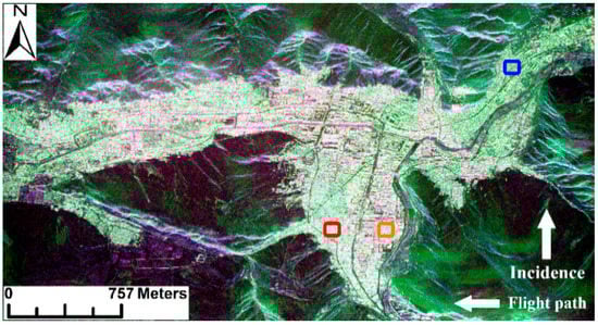 The Pauli RGB pseudocolor image for the full-polarimetric SAR data of Yushu County urban region. The areas in the red, blue, and orange rectangles are the samples of CB, OB, and parallel buildings (PB), respectively.
