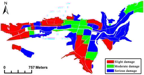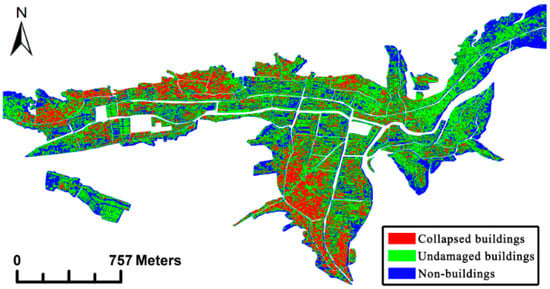 According to the procedure of BDA described in Section 2.2.5, the BDLs of the Yushu urban region were evaluated using the postearthquake PolSAR data and the proposed approach.