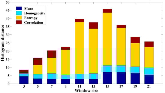 The histogram distance method mentioned in the previous section was employed to select the window size of the texture extraction. In order to compare the separability between the CB and the OB of the four texture features with different window sizes, a stacked bar chart of the histogram distance for the four textures with different window sizes is shown in Figure 12. The separation performance of the four texture features increases with the height of the bar. It can be seen from Figure 12 that the sum of the histogram distance reaches its maximum value at the window size of 15. Therefore, the window size for calculating the four texture features was set as 15.