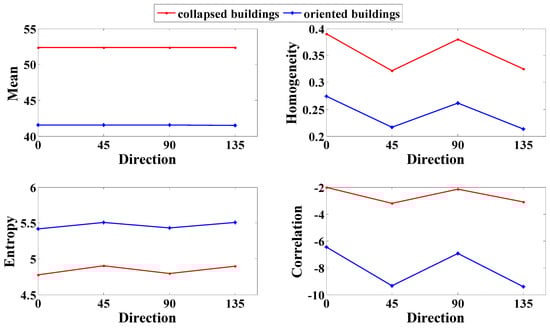 In Figure 5a, the mean texture feature shows a good ability to separate the two kinds of buildings, but the discriminative ability is inferior to that of the mean texture feature in Figure 5b. The homogeneity texture feature and the entropy texture feature show little ability to separate the two kinds of buildings in Figure 5a, but their discriminative ability is greatly improved in Figure 5b. The performance of the correlation texture feature for separating the two kinds of buildings is not satisfactory in Figure 5a, but it is improved in Figure 5b.