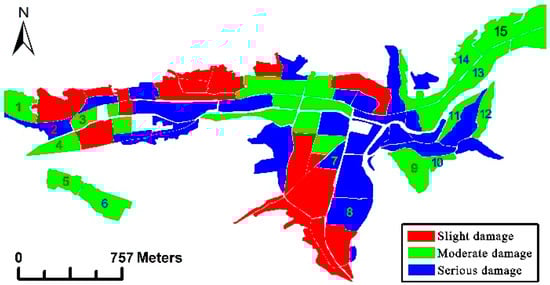 In the PolSAR data, the mountains surrounding the urban region were removed by masking, and then only the urban area was kept for our experiment. Being subject to the resolution of the PolSAR image and the tremendous amount of buildings in the study region, instead of identifying the damage extent of single buildings, the city block damage level was the investigation target. For the sake of the accuracy assessment, the whole urban area was divided into 72 city blocks by the roads in the urban region based on the comparability of the built-up blocks. The BDA reference information is displayed in Figure 11 according to the references [49,50]. The BDLs of the 72 city blocks were divided into SLD, MOD, and SED according to the reference [51]. If the CB in a city block are less than one-third of the total buildings, the block will be considered as SLD. SED is defined as more than half of the buildings collapsed in a city block. If the BDL of a city block is between SLD and SED, the block will be regarded as MOD.