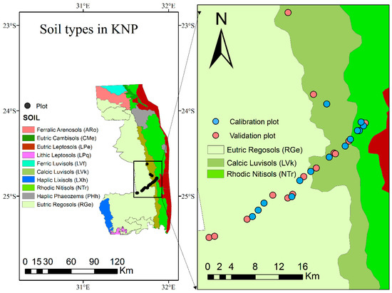 Soil types in KNP, the main soil types in the field plot area, field plot data (the blue and pink points indicate calibration and validation plots, respectively.
