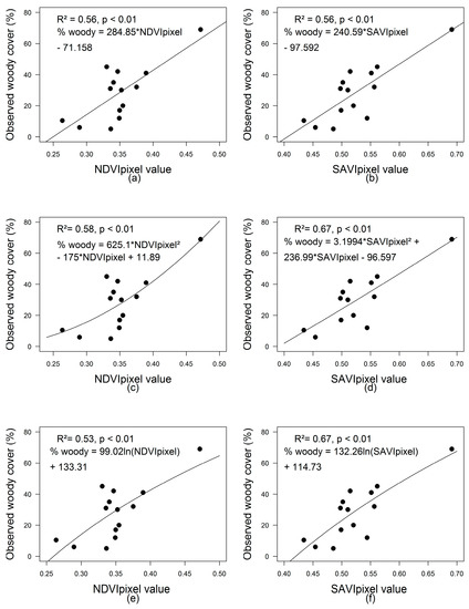 (1) Since the assumption to use the mean of the images of chosen MODIS data (NDVIpixel and SAVIpixel) does not preclude the presence of bare soil, different regression models were tested for estimating woody cover. Although it has previously been reported that the relationship between vegetation indices (especially NDVI) and percent cover depends largely on vegetation type [60], or may even have a strong linear relationship with sparse vegetation [66,67], it is not well known how the relationship with woody cover would be in KNP. Therefore, simple linear, polynomial and logarithmic models were tested for both vegetation indices to find the best fit for percent woody cover estimation.