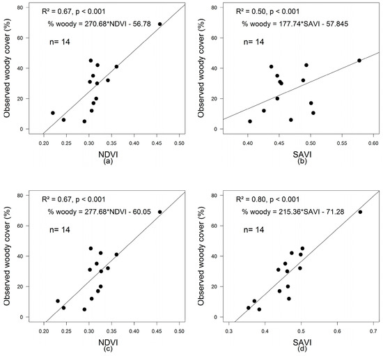 Calibration of NDVI and SAVI for woody estimate considering two methods for correcting soil variation background effects using a modified procedure by Zeng et al. [34] and Wu et al. [35]; NDVIZeng (a) and NDVIWu (c), NDVIZeng (b) and NDVIWu (d).