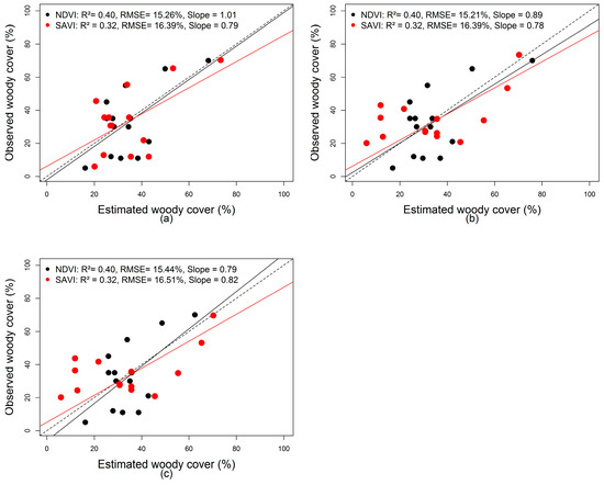 Validation of woody cover estimates derived with NDVIpixel and SAVIpixel using regression analyses, (a) with simple linear; (b) polynomial; (c) logarithmic regressions.