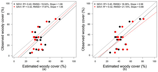 Validation of NDVI and SAVI woody cover estimates from the (a) modified procedure by Zeng et al. [34] and the (b) modified procedure by Wu et al. [35].