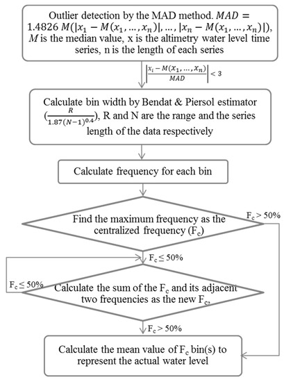 - Find the maximum frequency as the concentrated frequency (Fc). If Fc > 50%, then go to step 6, otherwise, go to step 5. This step aimed to detect the majority of “correct” altimetry water levels.