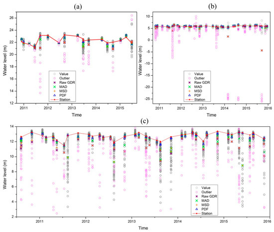 Altimetry and in situ station gauging lake levels for (a) Luoma Lake, (b) Gaoyou Lake, and (c) Hongze Lake. Circles are GDR values for each along-track segment, in which the light magenta circles are outliers. Red dots are station gauging water levels, while blue triangles, green “×”, orange “+”, and purple “∗” are altimetry water levels detected by the concentrated PDF, the median absolute deviation (MAD) method, the mean and standard deviation (MSD) method, and the raw GDR, respectively.