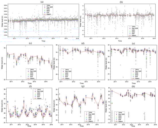 The concentrated PDF method was evaluated and validated by in situ lake level data. In addition, the performance of the raw GDR data and the two common outlier detection methods, the MSD and the MAD, was also evaluated by in situ data. For the MSD method, a limit of μ ± 3SD was used to detect outliers.