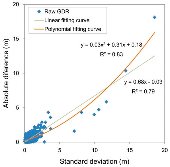 It can be seen from Figure 4 and Figure 5 that the altimetry errors of the raw GDR had a strong correlation with the SD of each along-track segment. Figure 6 shows a scatter plot of the SD for each along-track segment against the absolute difference of the raw GDR by comparing them with the in situ water levels of all lakes. The mean SD of all along-track segments was 0.80 m. The R2 of the raw GDR was 0.79 and 0.83 for the linear and polynomial regressions, respectively. Overall, the altimetry errors of the raw GDR showed a strong positive correlation with the SD of each along-track segment. In other words, the greater the SD, the greater the error. The concentrated PDF method improved the altimetry lake levels more for the along-track segments with larger SDs (Figure 4 and Figure 5). However, this positive correlation was lower at some lakes, including the Nanyang, the Dushan, the South Dongting, the Qinghai, and the Tai lakes. This indicated that the effects of the SD on the accuracy of the raw GDR were comparatively lower at these lakes, although the raw GDR heights displayed a relatively higher accuracy. This was verified by the RMSE results, since the RMSE was also lower at these lakes (<0.4 m). These five lakes could, therefore, be classified into three categories. First were the lakes with a lower SD for each along-track segment (<0.3 m), including the first two lakes. The second was the larger lakes, including the last two lakes. The third was South Dongting Lake, which only had approximately 10 GDR measurements in each along-track segment, as its width in the along-track direction was only around 3~4 km.