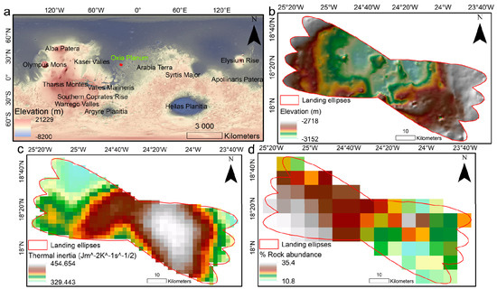 Oxia Planum as the study site for ExoMars 2020 landing. (a) Mars Orbiter Laser Altimeter (MOLA)-derived topography map of Mars showing location of Oxia Planum as the red dot (MOLA data courtesy: NASA/JPL/Goddard). (b) MOLA topography of Oxia Planum within expected landing ellipses (3-σ) [34]. (c) Mars Global Surveyor (MGS) Thermal Emission Spectrometer (TES)-derived thermal inertia [36] for Oxia Planum landing ellipses. (d) TES-derived % rock abundance [37] map for Oxia Planum landing ellipses.