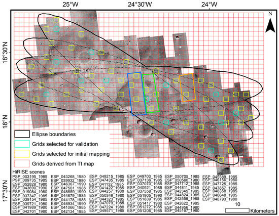 For the purpose of rover surface mobility, it is not the one-off TARs which are significantly dangerous as they can be avoided using even the rover mast cameras. The main problem arises when the rover encounters the contiguous stretches of TARs which can be actually hazardous for the rover mobility. Such closely located TARs are predominant in Oxia Planum. However, in our mapping, we identified and mapped both the singular TARs and the contiguous stretches of TARs in the selected grids. We used “Create Fishnet” tool of ArcGIS software and provided TES TI raster (Figure 1c) as the “template extent” dataset to derive corresponding grids of 2 × 2 km2 dimensions (Figure 2). As mentioned above, our study area is the region within the ellipse boundaries and therefore, to have a representative, balanced analysis of this wide region, we selected 66 grids uniformly distributed throughout the ellipses (Figure 2) and covering a total area of 264 km2 for HiRISE-based TAR mapping. In total, 57 sub-meter resolution HiRISE scenes (Figure 2) were selected to form the composite that covered nearly all of the study area and assisted in TAR mapping. We used the physical account well-described in the literature [5,10,38] to identify TARs in the images. TARs characteristically form in groups of tens to thousands of individual units and can easily be characterized by their small, narrow, and transverse dimensions, and elongated form [10]. Slip faces are typically resolvable only in high-resolution HiRISE images, and the opposite slopes appear to be nearly symmetric [5,10,38].