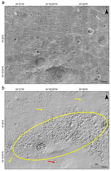 Common DTM artifacts. A region in Oxia Planum as seen in (a) HiRISE image PSP_009735_1985_RED and its corresponding (b) shaded relief derived from the DTM (DTEEC_009880_1985_009735_1985_L01; blue rectangle in Figure 2). The yellow ellipse highlights faceted areas and the yellow arrows highlight charged coupled device (CCD) seams. The red arrow shows clearly visible simple TARs. HiRISE image and DTM credit: NASA/JPL/University of Arizona.
