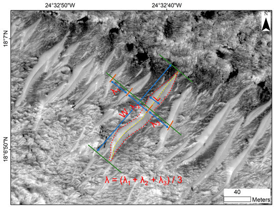 Elements of morphometry for transverse aeolian ridges (TARs) as seen in HiRISE image PSP_009735_1985. The red dashed curves represent the TAR boundary and the yellow curve represents the crestline. W = crest-ridge width, L = down-wind TAR length, λ = ridge-to-ridge mean spacing (wavelength). HiRISE image credit: NASA/JPL/University of Arizona.