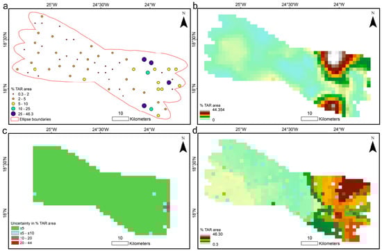 TAR distribution across the study area. (a) % TAR area within the mapped grids. (b) TAR distribution as areal % per grid spatially interpolated using 53 mapped grids. (c) % uncertainty in interpolated % TAR area estimated using 13 mapped grids. (d) Areal distribution of TARs based on spatial interpolation using all the 66 mapped grids.
