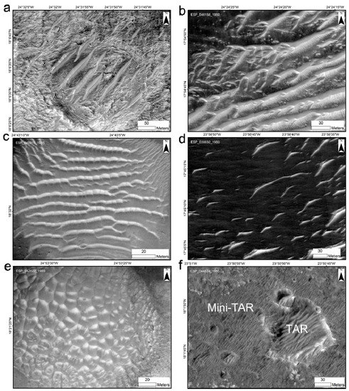 - Berman, D.C.; Balme, M.R.; Rafkin, S.C.; Zimbelman, J.R. Transverse aeolian ridges (TARs) on Mars II: distributions, orientations, and ages. Icarus 2011, 213, 116–130. [Google Scholar] [CrossRef]