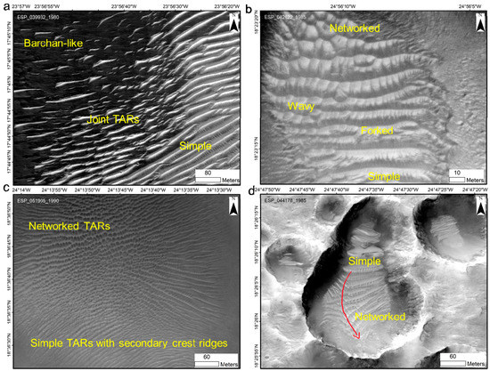 We also observed several examples of TAR transitions as reported by Balme et al. [10] for the Meridiani region. Figure 7a highlights one case where barchan-like TARs coalesce to form joint and simple TARs through merging of their crest ridges. These barchan-like TARs usually display crest-ridge widths (W) of ~20–50 m and down-wind TAR lengths (L) of ~10–15 m. The simple TARs which they form can display average W of ~500 m. However, this transition is rare in the study area. Spatial transitions from simple, forked, and wavy TARs into networked TARs are relatively common in the study area (Figure 7b–d). In Figure 7b, we observe gradual transitions from simple to forked to wavy, and ultimately to networked morphologies. Figure 7c presents a case where secondary ridge crests forming approximately perpendicular to the largest simple TAR crest ridges display a transition to networked TARs. These TARs with secondary ridge crests are also called “feathered” TARs by Bourke et al. [18]. The W of these feathered TARs in the study area usually vary between 200–400 m. Figure 7d presents an interesting case of transition from simple to networked morphology as a possible combination of downslope winds and steep topography. Figure 7d also shows an elongated depression as a result of two merged craters. The shadows on the left suggest the topographic gradient with higher elevations in the smaller crater and gradual deepening towards the larger crater. Moving downslope from the border of the merged craters to the center of the larger crater, the simple TARs start showing transition and change in orientation along the marked red arrow (Figure 7d).